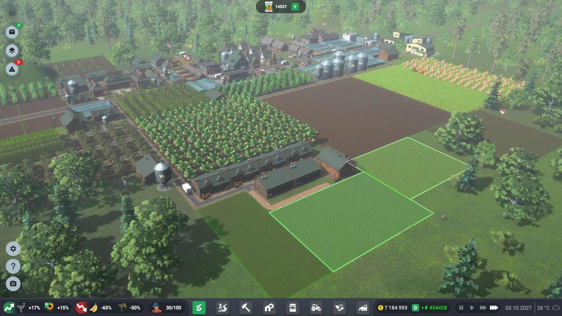 Продуманная планировка полей и склада позволит оптимизировать логистику и хранение урожая. Следите за сроками годности продуктов и своевременно отправляйте товары на рынок. Анализируйте спрос и предложение, чтобы выгодно покупать сырьё и продавать готовую продукцию - каждое ваше решение влияет на мировые цены.